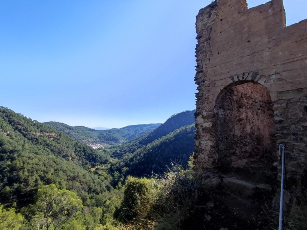 El castell de Benialí, situat entre el pic Batalla i el Massís d’Espadà, amb el poble d’Aín al fons. El lloc morisc de Benialí va quedar despoblat després de la Batalla d’Espadà i les excavacions dels anys 80 mostraren que va ser un lloc on l’abandonament es produí en un context de violència.