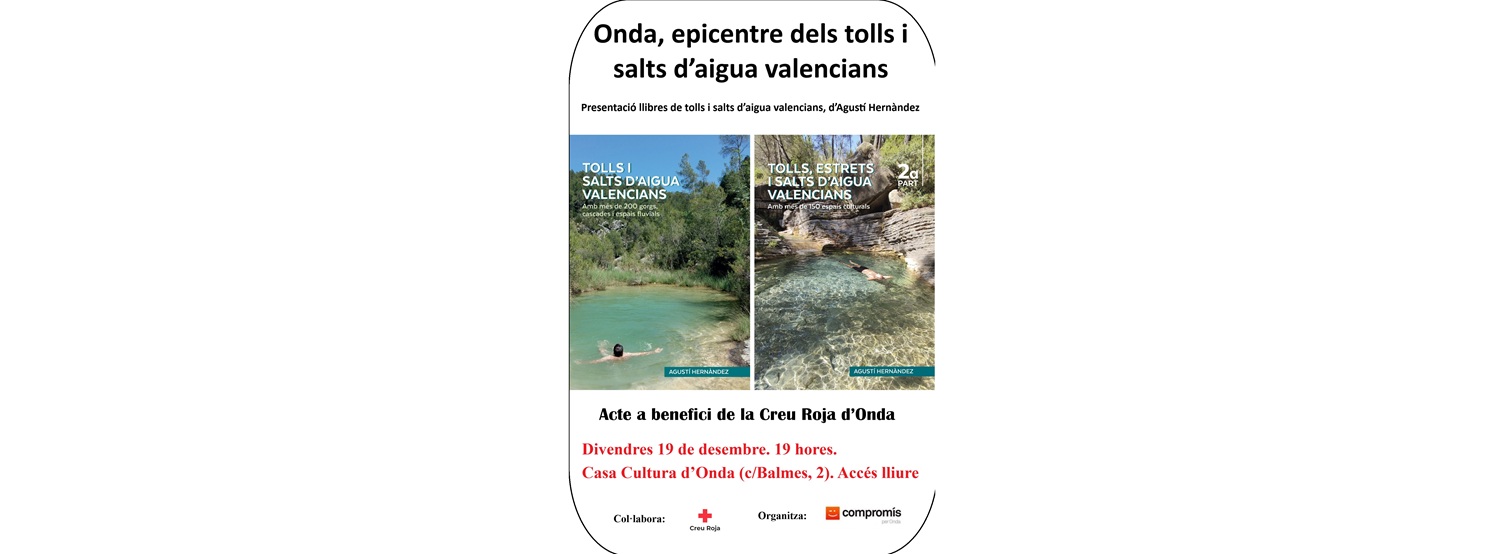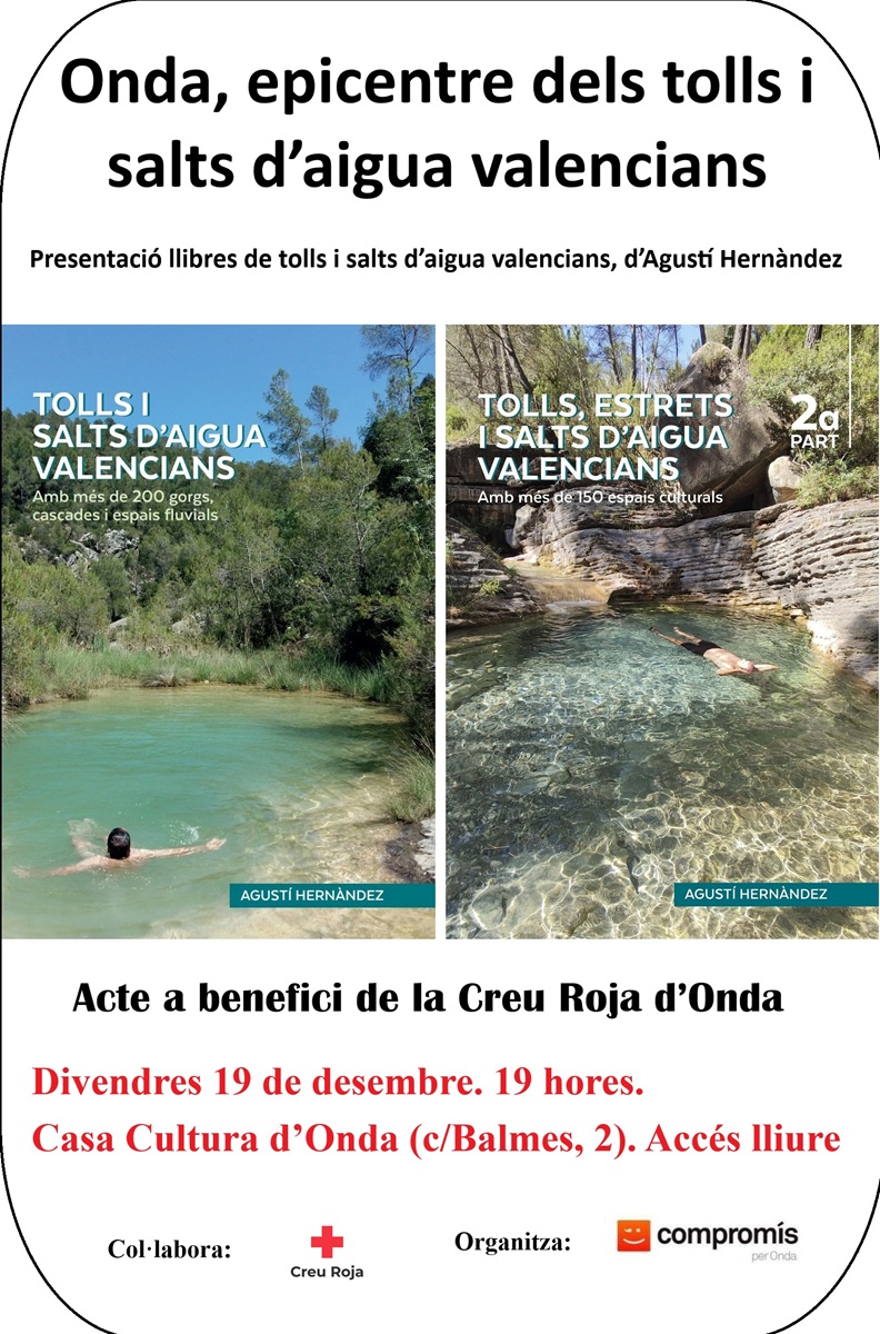 ONDA. PRESENTACIÓ LLIBRES TOLLS I SALTS D’AIGUA, A BENEFICI DE CREU ROJA. Onda, amb una ubicació privilegiada, és el poble valencià amb més tolls i salts d’aigua prop. La Serra d’Espadà i els seus rius a l’oest i el sud-oest; el Millars i el Villahermosa, a l’oest i el nord-oest, amb desenes d’afluents amb aigua tot l’any; i el Llucena i d’altres cap al nord, converteixen Onda en un poble privilegiat per als amants de la natura i l’aigua dolça. El periodista Agustí Hernàndez presentarà divendres 19 de desembre a les 19 hores en la casa de cultura d’Onda els seus llibres ‘Tolls i salts d’aigua valencians’ i ‘Tolls, estrets i salts d’aigua valencians. 2ª part’, en un acte organitzat per Compromís per Onda, i on tots els beneficis obtinguts de la venda serán per a Creu Roja d’Onda, destinats a ser invertits en projectes vinculats a l’entorn. Accés lliure.